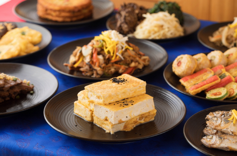 - 떡국, 나물, 구이, 김치, 술(잔), 과일 4종 등 총 9가지 음식으로 구성.